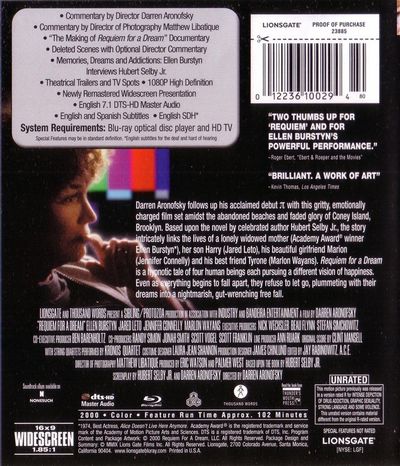 Darren Aronofsky, director of the critical smash Pi, follows up his acclaimed debut with a gritty, stylish, emotionally charged story of love, loss, drugs and dreams amid the faded glory of Coney Island. Intricately linking the lives of a struggling, small-time drug dealer (Jared Leto), his pill-popping mother (Ellen Burstyn), his upper-class girlfriend (Jennifer Connelly) and his best friend Tyrone (Marlon Wayans), Requiem For A Dream is a hypnotic tale of four human beings each pursuing their vision of happiness. Even as everything begins to fall apart, they refuse to let go, plummeting with their dreams into a nightmarish, gut-wrenching free fall. |