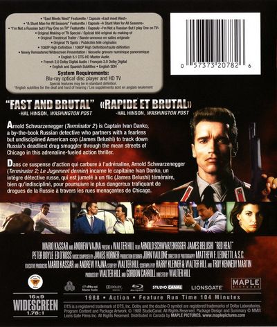 Arnold Schwarzenegger (Terminator 2) is Captain Ivan Danko, a by-the-book Russian detective who partners with a fearless but undisciplined American cop (James Belushi) to track down Russia's deadliest drug smuggler through the mean streets of Chicago in this adrenaline-fueled action thriller.Dans ce suspense d'action qui carbure a l'adrénaline, Arnold Schwarzenegger (Terminator 2; Le Jugement dernier) incarne le capitaine Ivan Danko, un intégre détective russe, qui est jumelé a un flic (James Belushi) téméraire, bien qu'indiscipliné, pour poursuivre le plus dangereux trafiquant de drogues de la Russie à travers les rues menaçantes de Chicago. |