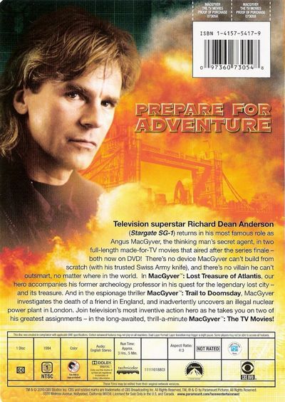 Television superstar Richard Dean Anderson (Stargate SG-1) returns in his most famous role as Angus MacGyver, the thinking man's secret agent, in two full-length made-for-TV movies that aired after the series finale - both now on DVD! There's no device MacGyver can't build from scratch (with his trusted Swiss Army knife), and there's no villain he can't outsmart, no matter where in the world. In MacGyver™: Lost Treasure of Atlantis, our hero accompanies his former archeology professor in his quest for the legendary lost city - and its treasure. And in the espionage thriller MacGyver™: Trail to Doomsday, MacGyver investigates the death of a friend in England, and inadvertently uncovers an illegal nuclear power plant in London. Join television's most inventive action hero as he takes you on two of his greatest assignments - in the long-awaited, thrill-a-minute MacGyver™: The TV Movies!