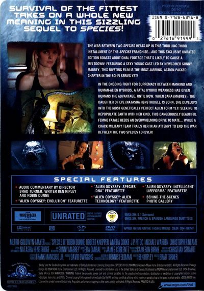 Beauty is only skin deep.The war between two species heats up in this thrilling third installment of the Species franchise...and this exclusive unrated edition boasts additional footage that's likely to cause a meltdown!. Featuring a sex young cast led by newcomer Sunny Mabrey, this riveting film is the most jarring, action-packed chapter in the sci-fi series yet!In the ongoing fight for supremacy between mankind and human-alien hybrids, a fatal hybrid weakness has given humans the advantage. Until now, when Sara (Mabrey), the daughter of Eve (Natasha Henstridge), is born, she develops into the most genetically perfect alien form yet! Seeking to repopulate Earth with her kind, this dangerously beautiful femme fatale heeds an overwhelming drive to mate...while a crack military team trails her in an attempt to end the war between the two species forever!