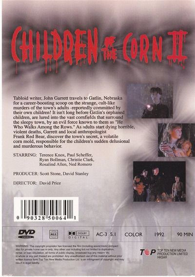 Tabloid writer, John Garrett travels to Gatlin, Nebraska for a career-boosting scoop on the strange, cult-like murders of the town's adults - reportedly committed by their own children! It isn't long before Gatlin's orphaned children, are lured into the vast cornfields that surround the sleepy town, by an evil force known to them as "He Who Walks Among the Rows." As adults start dying horrible, violent deaths, Garrett and local anthropologist Frank Red Bear, discover the town's secret, a volatile corn mold, responsible for the children's sudden delusional and murderous behavior. |