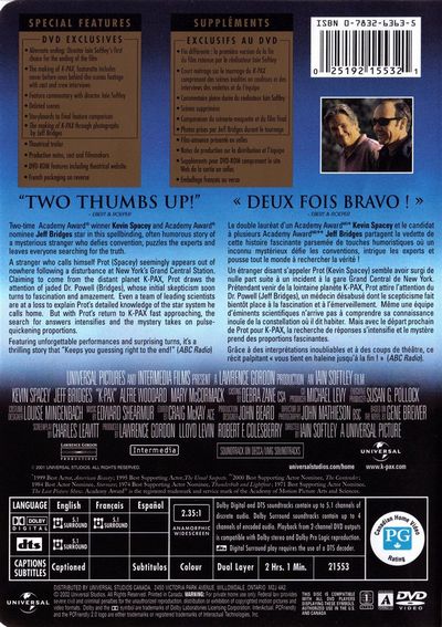 Two-time Academy Award® winner Kevin Spacey and Academy Award® nominee Jeff Bridges star in this spellbinding, often humorous story of a mysterious stranger who defies convention, puzzles the experts and leaves everyone searching for the truth.A stranger who calls himself Prot (Spaceyl seemingly appears out of nowhere following a disturbance at New York's Grand Central Station. Claiming to come from the distant planet K-PAX, Prot draws the attention of jaded Dr. Powell (Bridges), whose initial skepticism soon turns to fascination and amazement. Even a team of leading scientists are at a loss to explain Profs detailed knowledge of the star system he calls home. But with Prat's return to K-PAX fast approaching, the search for answers intensifies and the mystery takes on pulse-quickening proportions.Featuring unforgettable performances and surprising turns, it's a thrilling story that "Keeps you guessing right to the end!" (ABC Radio] Le double laureat d'un Academy Award™ Kevin Spacey et le candidat a plusieurs. Academy Award** Jeff Bridges partagent la vedette de cette histoire fascinante parsemee de touches humoristiques ou un inconnu mysterieux defie les conventions, intrigue les experts et pousse tout le monde a rechercher la verite ! Un etranger disant s'appeler Prot (Kevin Spacey) semble avoir surgi de nulle part suite a un incident a la pare Grand Central de New York. Pretendant venir de la lointaine planete K-PAX, Prot attire I'attention du Dr. Powell (Jeff Bridges), un medecin desabuse dont le scepticisme fait bientot place a la fascination et a I'emerveillement. Meme une equipe d'eminents scientifiques n'arrive pas a comprendre sa connaissance inouTe de la constellation ou il dit habiter. Mais avec le depart prochain de Prot pour K-PAX, la recherche de reponses s'intensifie et le mystere prend des proportions fascinantes.Grace a des interpretations inoubliables et a des coups de theatre, ce recit palpitant «voustient en haleinejusqu'a la fin!» (ABC Radio}.