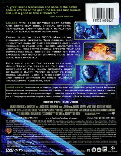 Loaded with edge-of-your-seat action and extremely cool special effects, "Battlefield Earth" creates a totally new style of science fiction filmmaking.Earth: It is the year 3000, man is an endangered species. This original and innovative saga of alien conquest and human rebellion is filled with humor, adventure and jeopardy, mixed with special effects that are completely real, combined together for an explosive and highly entertaining movie that will leave you exhausted!In a role as you've never seen him, John Travolta stars as the cruelly destructive Terl (Alien Security Chief of Earth); Barry Pepper is Earth's fiery rebel leader, jonnie Goodboy Tyler, and Forest Whitaker as Terl's hilarious and deceptive assistant, Ker. |