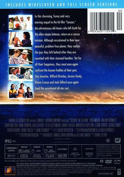 In this charming, funny and very moving sequel to the hit film "Cocoon," the adventurous old-timers who left Earth for the alien utopia Antarea, return on a rescue mission. Although accustomed to their new peaceful, problem-free planet, they realize the joys they left behind after they are reunited with their stunned families. Yet for all their happiness, they must once again confront the human frailties of their past. Don Ameche, Wilford Brimley, Jessica Tandy, Hume Cronyn and Jack Gilford once again head the sensational all-star cast. |