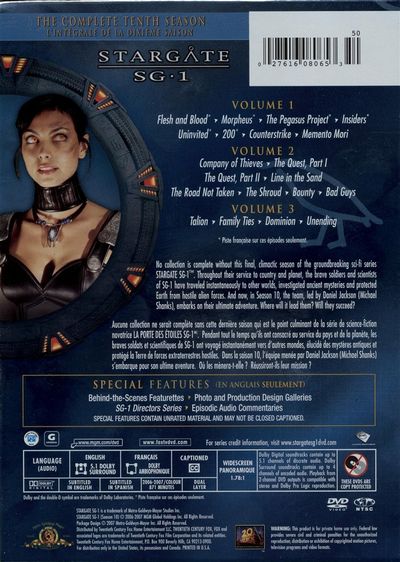No collection is complete without this final, climactic season of the groundbreaking sci-fi series STARGATE SG-1™. Throughout their service to country and planet, the brave soldiers and scientists of SG-1 have traveled instantaneously to other worlds, investigated ancient mysteries and protected Earth from hostile alien forces. And now, in Season 10, the team, led by Daniel Jackson (Michael Shanks), embarks on their ultimate adventure. Where will it lead them? Will they succeed?Volume 1:Flesh and BloodMorpheusThe Pegasus ProjectInsidersUnvited200CounterstrikeMemento MoriVolume 2:Company of ThievesThe Quest, Part IThe Quest, Part IILine in the SandThe Road Not TakenThe ShroudBountyBad GuysVolume 3:TalionFamily TiesDominionUnending |