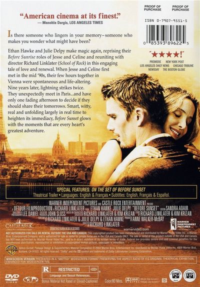 Is there someone who lingers in your memory - someone who makes you wonder what might have been?Ethan Hawke and Julie Delpy make magic again, reprising their Before Sunrise roles of Jesse and Celine and reuniting with director Richard Linklater (School of Rock) in this engaging tale of love and renewal. When Jesse and Celine first met in the mid '90s, their few hours together in Vienna were spontaneous and life-altering. Nine years later, lightning strikes twice. they unexpectedly meet in Paris...and have only one fading afternoon to decide if they should share their tomorrows. Smart, witty, real and unfolding largely in real time to heighten its immediacy, Before Sunset glows with the moments that are every heart's greatest adventure