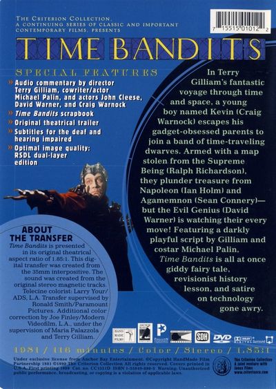 In Terry Gilliam's fantastic voyage through time and space, a young boy named Kevin (Craig Warnock) escapes his gadget-obsessed parents to join a band of time-traveling dwarves. Armed with a map stolen from the Supreme Being (Ralph Richardson), they plunder treasure from Napoleon (Ian Holm) and Agamemnon (Sean Connery)--but the Evil Genius (David Warner) is watching their every move! Featuring a darkly playful script by Gilliam and costar Michael Palin, Time Bandits is all at once giddy fairy tale, revisionist history lesson, and satire in technology gone awry. |