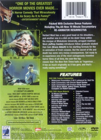 Disc One:• Audio Commentary with Director Stuart Gordon• Audio Commentary with Producer Brian Yuzna and Actors Bruce Abbott, Jeffrey Combs, Barbara Crampton and Robert SampsonDisc Two:• 70-Minute Featurette: RE-ANIMATOR RESURRECTUS• Interview with Director Stuart Gordon and Producer Brian Yuzna• Interview with Writer Dennis Paoli• Interview with Composer Richard Band• Music Discussion with Composer Richard Band• Interview with Fangoria Editor Tony Timpone• Deleted Scene• Extended Scenes• Trailer• TV Spots• Production Stills Gallery, Behind-The-Scenes Still Gallery• Fun On The Set Still Gallery• Posters And Advertising Gallery• Storyboard Gallery• Stuart Gordon Bio• Screenplay (DVD-ROM)• "Herbet West, Reanimator" by H.P. Lovecraft (DVD-ROM) |