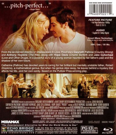 From the acclaimed directo of Shakespeare In Love, Proof stars Gwyneth Paltrow (Country Strong) and Anthony Hopkins (The Rite), along with Hope Davis (CHarlie Bartlett) and Jake Gyllenhaal (Love and Other Drugs), in a powerful story of a young woman haunted by her father's past and the shadow of her own future.Catherine (Paltrow) has devoted years to caring for her brilliant but mentally unstable father, Robert (Hopkins), a mathematical genius. But when his genius slips away, he leaves behind a mystery that affects her life... and her own sanity. Based on the Pulitzer Prize-winning play. |