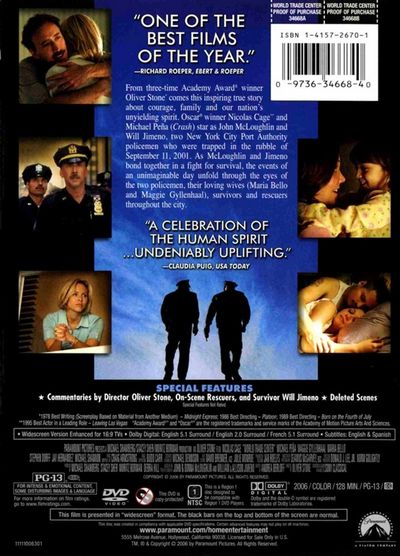 From three-time Academy Award® winner Oliver Stone comes this inspiring true story about courage, family and our nation's unyielding spirit. Oscar® winner Nicolas Cage and Michael Peña (Crash) star as John McLoughlin and Will Jimeno, two New York City Port Authority policemen who were trapped in the rubble of September 11, 2001. As McLoughlin and Jimeno bond together in a fight for survival, the events of an unimaginable day unfold through the eyes of the two policemen, their loving wives (Maria Bello and Maggie Gyllenhaal), survivors and rescuers throughout the city. |