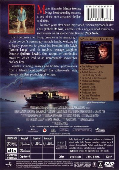 Master filmmaker Martin Scorsese brings heart-pounding suspense to one of the most acclaimed thrillers of all time.Fourteen years after being imprisoned, vicious psychopath Max Cady (Robert De Niro) emerges with a single-minded mission: to seek revenge on his attorney Sam Bowden (Nick Nolte).Cady becomes a terrifying presence as he menacingly circles Bowden's increasingly unstable family. Realizing he is legally powerless to protect his beautiful wife Leigh (Jessica Lange) and his troubled teenage daughter Danielle (Juliette Lewis), Sam resorts to unorthodox measures which lead to an unforgettable showdown on Cape Fear.Visually stunning images and brilliant performances from a talented cast highlight this roller-coaster ride through relentless psychological torment. |