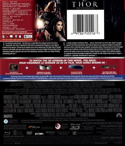 The world has many heroes...but only one is a god. When the arrogant warrior Thor (Chris Hemsworth, Star Trek) is banished to Earth from his homeworid of Asgard. he must fight to reclaim his lost powers. Pursued by an invasion force sent to destroy him, the fallen God of Thunder must rise to the battle and learn what it takes to become a true hero. Natalie Portman (Black Swan) and Anthony Hopkins (Beowulf) also star in the blockbuster adventure critics are calling "thrilling, entertaining and cool."Le monde compte de nombreux héros... mais un seul d'entre eux est un dieu. Quand l'arrogant guerrier Thor (Chris Hemsworth, Star Trek) est banni de son royaume d'Asgard et condamné à vivre sur la Terre, il doit lutter pour récupérer ses pouvoirs perdus. Poursuivi par une force d'invasion envoyée pour le détruire, le dieu déchu du tonnerre doit se montrer à la hauteur de la bataille et puiser en lui-même la force d'un vrai héros. Natalie Portman (Le Cygne noir) et Anthony Hopkins (La Légende de Beowulf) partagent également la vedette de cette méga-aventure que la critique a qualifiée de « captivante, divertissante et audacieuse ». |