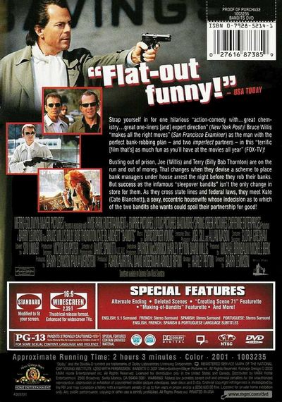 Strap yourself in for one hilarious "action-comedy with… great chemistry… great one-liners [and] expert direction" (New York Post)! Bruce Willis "makes all the right moves" (San Francisco Examiner) as the man with the perfect bank-robbing plan - and two imperfect partners - in this "terrific [film that's] as much fun as you'll have at the movies all year" (FOX-TV)!Busting out of prison, Joe (Willis) and Terry (Billy Bob Thornton) are on the run and out of money. That changes when they devise a scheme to place bank managers under house arrest the night before they rob their banks. But success as the infamous "sleepover bandits" isn't the only change in store for them. As they cross state lines and federal laws, they meet Kate (Cate Blanchett), a sexy, eccentric housewife whose indecision as to which of the two bandits she wants could spoil their partnership for good! |