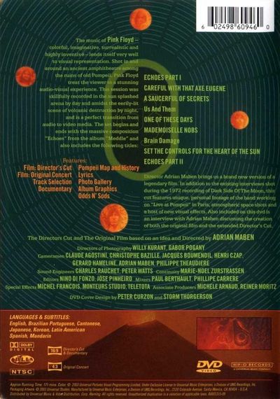 The music of Pink Floyd - colorful, imaginative, surrealistic and highly inventive - lends itself very well to visual representation. Shot in and around an ancient amphitheatre among the ruins of old Pompeii, Pink Floyd treat the viewers to a stunning audio-visual experience. This session was skillfully recorded in the sun splashed arena by day and amidst the eerily-lit scene of volcanic destruction by night, and is a perfect transition from audio to video media. The set begins and ends with the massive composition "Echoes" from the album "Meddle" and also includes the following titles:ECHOS PART ICAREFUL WITH THAT AXE EUGENEA SAUCERFUL OF SECRETSUs And ThemONE OF THESE DAYSMADEMOISELLE NOBSBrain DamageSET THE CONTROLS FOR THE HEART OF THE SUNECHOES PART IIDirector Adrian Maben brings us a brand new version of a legendary film. In addition to the existing interviews shot during the 1972 recording of Dark Side Of The Moon, this cut features unique, personal footage of the band working on "Live at Pompeii" in Paris, atmospheric space shots and a host of new visual effects. Also included on this dvd is an interview with Adrian Maben discussing the creation of both the original film and the extended Director's Cut.