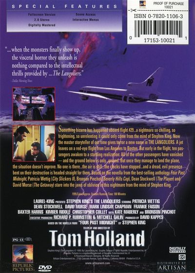 Something bizarre has happened abourd flight #29...a nightmare so chilling, so frightening, so unrelenting it could only come from the mind of Stephen King. Now the master storyteller of our time gives terror a new name in THE LANGOLIERS. A jet leaves on a red-eye flight from Los Angeles to Boston. But early in the flight, ten passengers awaken to a startling realization: All of the other passengers have vanished - and the ground below is only...ground. But once they manage to land the plane, the situation doesn't improve. No one is there...the air is still...the clocks have stopped...and a dread, evil presence bent on their destruction is headed straight for them. Based on the novella from the best-selling anthology Four Past Midnight, Patricia Wettig (City Slickers II), Bronson Pincho (Beverly Hills Cop), Dean Stockwell (The Player), and David Morse (The Getaway) stare into the jaws of oblivion in this nightmare from the mind of Stephen King.
