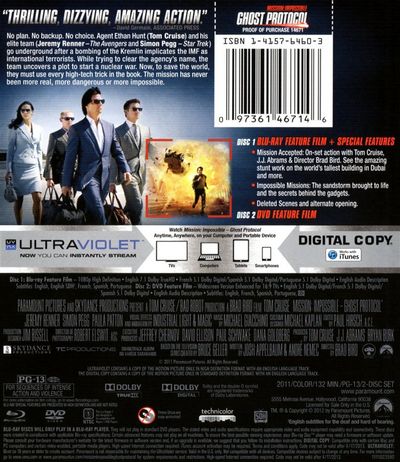 No plan. No backup. No choice. Agent Ethan Hunt (Tom Cruise) and his elite team (Jeremy Renner, The Avengers and Simon Pegg, Star Trek) go underground after a bombing of the Kremlin implicates the IMF as international terrorists. While trying to clear the agency's name, the team uncovers a plot to start a nuclear war. Now, to save the world, they must use every high-tech trick in the book. The mission has never been more real, more dangerous, or more impossible. |