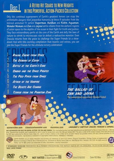Only the combined superpowers of Earth?s greatest heroes can stop the unthinkable dangers that jeopardize humanity in these 16 episodes from the beloved animated TV series! Superman, Batman and Robin, Aquaman, Wonder Woman and Zan and Jayna battle villains from the darkest regions of outer space to the depths of the ocean in their fight for truth and justice. They face extraordinary perils at the core of the Earth and defy the laws of nature to shrink to microscopic size to defeat a radioactive monster. Even Dracula returns from the grave to challenge the Super Friends to a showdown! And with this exciting compilation that boasts cool extras, you can join the Super Friends for the ultimate victory celebration!DVD Features:Featurette:"Pajama-Rama: Super Friends Retrospective" [A group of pop culture enthusiasts and fun celebrities share their memories of the world's greatest team of '70's super-heroes, The Super Friends !]Music Video:"The Ballad of Zan & Jayna"- [ A wild and wacky music video celebrating the Wonder Twins, and of course, their pet primate Gleek !] |