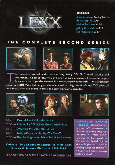 Original Uncut VersionThe complete second series of the sexy, funny SCI FI Channel favorite and international hit called "Star Trek's evil twin." A crew of outcasts from an evil empire bounce around a parallel universe in a stolen, organic spacecraft- the awesomely powerful LEXX. With bold original characters and dazzling special effects, LEXX takes off on a totally new kind of trip in these 20 highly imaginative episodes.SC-V1 Mantrid, Terminal, Lyekka, LuvlinerSC-V2 Lafftrak, Stan's Trial, Love Grows, White TrashSC-V3 791, Wake the Dead, Nook, NorbSC-V4 Twilight, Patches in the Sky, Woz, The WebSC-V5 The Net, Brigadoom, Brizon, End of the Universe |