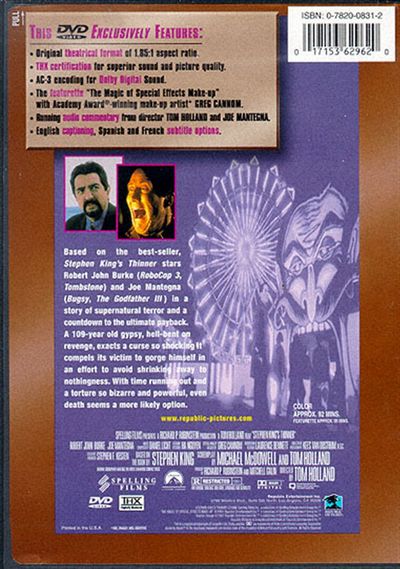 Let the curse fit the crime.A fat Lawyer finds himself growing "Thinner" when an old gypsy man places a hex on him. Now the lawyer must call upon his friends in organized crime to help him persuade the gypsy to lift the curse. Time is running out for the desperate lawyer as he draws closer to his own death, and grows ever thinner. |