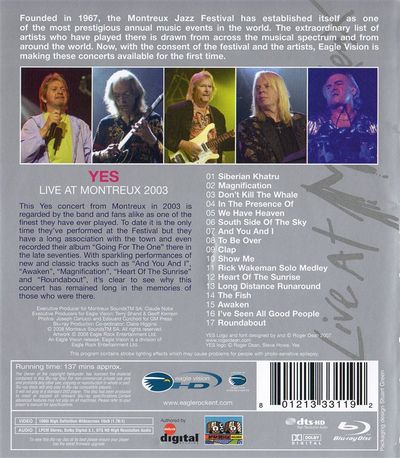 Founded in 1967, the Montreux Jazz Festival has established itself as one of the most prestigious annual music events in the world. The extraordinary list of artists who have played there is drawn from across the musical spectrum and from around the world. Now, with the consent of the festival and the artists, Eagle Vision is making these concerts available for the first time.This Yes concert from Montreux In 2003 is regarded by the band and fans alike as one of the finest they have ever played. To date it is the only time theyVe performed at the Festival but they have a long association with the town and even recorded their álbum "Going For The One" there in the late seventies. With sparkling performances of new and classic tracks such as "And You And l", "Awaken", "Magnification", "Heart Of The Sunrise" and "Roundabout", it's clear to see why this concert hás remained long in the memories of those who were there.01-Siberian Khatru 02-Magnification03-Don't Kill The Whale 04-In The Presence Of 05-We Have Heaven06-South Side Of The Sky 07-And You And l 09-Clap10-Show Me 11-Rick Wakeman Solo Medley12-Heart Of The Sunrise13-Long Distance Runaround14-The Fish15-Awaken 16-l've Seen All Good People17-Roundabout