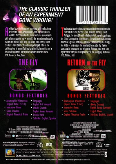 The Fly (1958 / 94 min.)A brilliant scientist becomes obsessed with perfecting a device that can transmit matter from one location to another. Successful in his initial test, he experiments with a human guinea pig -- himself. But an ordinary housefly makes the journey with him, and when they emerge, both creatures have been extraordinarily changed. This is the chilling story of a man fighting to retain his humanity, and a desperate woman's attempt to save the man she loves.Return Of The Fly (1959 / 80 min.)The boundaries of science are pushed to their eery limits in this sequel to the classic, ever-popular The Fly. Here, Philippe, the son of the ill-fated scientist, naively continues his father's misguided experiments. The victim of his traitorous assistant's greedy ambitions, Philippe finds himself in a terrifying limbo -- he's grown the head and limbs of a fly! Taking spectacular revenge on his betrayers, Philippe must also race against time and find a way to reverse the horrifying mutation. |