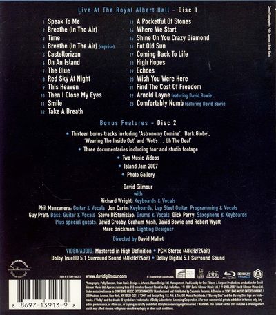 Live At The Royal Albert Hall1. Speak To Me2. Breathe (In The Air)3. Time4. Breathe (In The Air) (reprise)5. Castellorizon6. On An Island7. The Blue8. Red Sky At Night9. This Heaven10. Then I Close My Eyes11. Smile12. Take A Breath13. A Pocketful of Stones14. Where We Start15. Shine On You Crazy Diamond16. Fat Old Sun17. Coming Back To Life18. High Hopes19. Echoes20. Wish You Were Here21. Find The Cost Of Freedom22. Arnold Layne featuring David Bowie23. Comfortably Numb featuring David Bowie |
