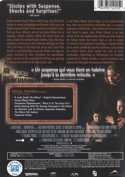 Screen sensation Nicole Kidman (Moulin Rouge, Eyes Wide Shut) delivers an utterly unforgettable performance in this scary and stylish suspense thriller! While awaiting her husband's return from war, Grace (Nicole Kidman) and her two young children live an unusually isolated existence behind the locked doors and drawn curtains of a secluded island mansion. Then, after three mysterious servants arrive and it becomes chillingly clear that there is far more to this house than can be seen, Grace finds herself in a terrifying fight to save her children and keep her sanity! Acclaimed by critics everywhere, the unpredictable twists and turns of this compelling hit will keep you guessing as it keeps you rivited to the edge of your seat!La star Nicole Kidman (Moulin Rouge, Les Yeux Grands Fermés) nous offre une performance mémorable dans ce suspense angoissant et bien ficelé! Dans l’attente de son mari parti au front avant la guerre, Grace (Nicole Kidman) et ses deux enfants vivent une existence isolée derrière des portes closes et des rideaux fermés d’un manoir érigé sur une île recluse. À l’arrivée de trois mystérieux domestiques, il devient évident que la maison possède des pouvoirs mystérieux. Grace (Nicole Kidman) protège ses enfants atteints d’une maladie rare, mais les forces surnaturelles s’intensifient et l’affrontement est inévitable. Acclamé par la critique mondiale, ce succès retentissant vous réserve une finale aussi surprenante qu’imprévisible!