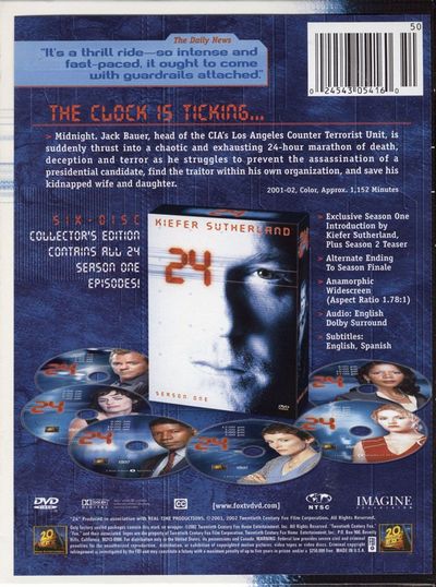 The Clock Is Ticking...Midnight, Jack Bauer, head of CIA's Los Angeles Counter Terrorist Unit, is suddenly thrust into a chaotic and exhausting 24-hour marathon of death, deception and terror as he struggles to prevent the assassination of a presidential candidate, find the traitor within his organization, and save his kidnapped wife and daugther. |