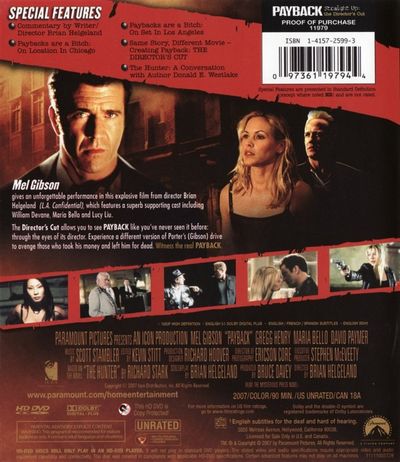 Mel Gibson gives an unforgettable performance in this explosive film from director Brian Helgeland (L.A. Confidential), which features a superb supporting cast including William Devane, Mario Bello and Lucy Liu.The Director's Cut allows you to see Payback like you've never seen it before: through the eyes of its director. Experience a different version of Porter's (Gibson) drive to avenge those who took his money and left him for dead. Witness the real Payback. |
