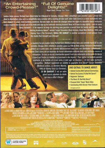 Golden Globe winner Richard Gere (Best Actor In A Musical Or Comedy, CHICAGO, 2002; UNFAITHFUL) and Jennifer Lopez (JERSEY GIRL, MAID IN MANHATTAN) step out in a delightfully sexy comedy with a sizzling all-star cast! John Clark (Gere) is a meek workaholic who feels trapped in a dull, mind-numbing existence. But one night, his whole life changes when the sight of a beautiful dance instructor (Lopez) inspires him to break out of his mold and sign up for ballroom dancing lessons! Now, he'll have to step lightly -- and do some fancy footwork -- if he expects to keep his exciting new passion a secret from his family and friends. Also starring Academy Award(R) winner Susan Sarandon (Best Actress, DEAD MAN WALKING, 1995) and Stanley Tucci (THE TERMINAL), SHALL WE DANCE? is another acclaimed crowd-pleaser from the studio that brought you CHICAGO! Le lauréat d’un prix Golden Globe Richard Gere (Meilleur acteur dans une comédie musicale ou une comédie, Chicago, 2002; Infidèle) et Jennifer Lopez (La Fille du New Jersey, Romance a Manhattan) brillent sur la piste dans une comédie délicieusement sexy avec une distribution éblouissante! John Clark (Gere) est un bourreau de travail débonnaire enfermé dans une existence morne et ennuyeuse. Un soir, sa vie est chambardée quand il voit une séduisante professeure de danse (Lopez) qui l’incite à s’évader en s’inscrivant à des leçons! Pour cacher sa nouvelle passion exaltante à sa famille et à ses amis, il doit agir en douceur… et non sans quelques pirouettes. Mettant également en vedette la gagnante d’un Oscar Susan Sarandon (Meilleure actrice, La Dernière Marche, 1995) et Stanley Tucci (Le Terminal), Si On Dansait? est un autre grand succès populaire du studio qui vous a offert Chicago!