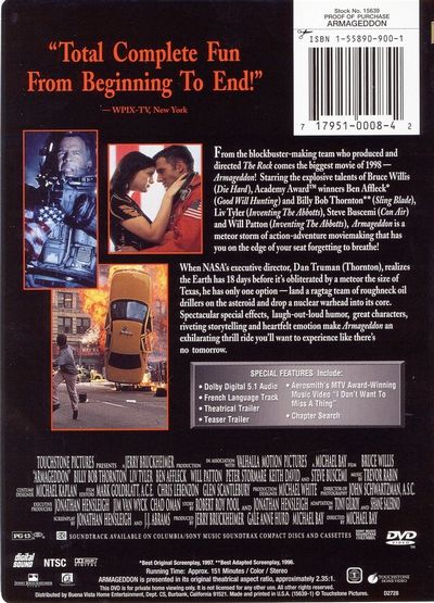 From the blockbuster-making team who produced and directed The Rock comes the biggest movie of 1998 - Armageddon! Starring the explosive talents of Bruce Willis (Die Hard), Academy Award winners Ben Affleck (Good Will Hunting) and Billy Bob Thorton** (Sling Blade), Liv Tyler (Inventing The Abbotts), Steve Buscemi (Con Air) and Will Patton (Inventing The Abbotts), Armageddon is a meteor storm of action-adventure moviemaking that has you on the edge of your seat forgetting to breathe!When NASA's executive director, Dan Truman (Thorton), realizes the Earth ha 18 days before it's obliterated by a meteor the size of Texas, he has only one option - land a ragtag team of roughneck oil drillers on the asteroid and drop a nuclear warhead into its core. Spectacular special effects, laugh-out-loud humor, great characters, riveting storytelling and heartfelt emotion make Armageddon an exhilarating thrill ride you'll want to experience like there's no tomorrow. |