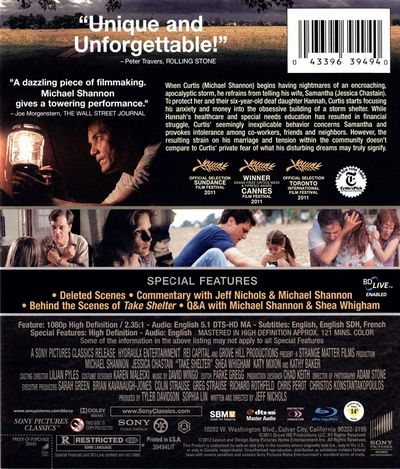 When Curtis (Michael Shannon) begins having nightmares of an encroaching, apocalyptic storm, he refrains from telling his wife, Samantha (Jessica Chastain). To protect her and their six-year-old deaf daughter Hannah, Curtis starts focusing his anxiety and money into the obsessive building of a storm shelter. While Hannah's healthcare and special needs education has resulted in financial struggle, Curtis' seemingly inexplicable behavior concerns Samantha and provokes intolerance among co-workers, friends and neighbors. However, the resulting strain on his marriage and tension within the community doesn't compare to Curtis' private fear of what his disturbing dreams may truly signify. |
