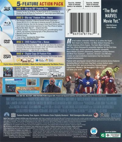 Marvel makes cinematic history as it unites the Super Hero team of a lifetime. Iron Man (Robert Downey Jr.), Captain America (Chris Evans), The Hulk (Mark Ruffalo), and Thor (Chris Hemsworth) assemble together for the first time ever in this epic, action-packed blockbuster alongside Black Widow (Scarlett Johansson), Hawkeye (Jeremy Renner) and Nick Fury (Samuel L. Jackson). Director Joss Whedon creates an unprecedented masterpiece that has become a global phenomenon.Packed with spectacular visual effects and exclusive bonus features including Marvel's first-ever Gag Reel, a never-before-seen Marvel Short Film and an interactive Second Screen Experience, MARVEL'S THE AVENGERS in Blu-ray 3D will blow your mind! |