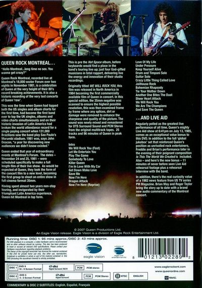 In November 1981, with “Under Pressure” topping the charts in the UK, Queen arrived in Montreal following dates in Japan and their record-breaking tour of Latin America. It was to be the first concert by Queen that was ever shot on film. Always a great live band, with arguably the greatest frontman of all time in Freddie Mercury, they excelled themselves with the cameras rolling. The picture has been digitally restored from the original film and the sound has been newly mixed and mastered for DTS Surround Sound and PCM Stereo from the original multitrack tapes.The Montreal concert is presented in high definition, while the Live Aid and all bonus materials will remain in standard definition.Tracklisting:1. Intro2. We Will Rock You (fast)3. Let Me Entertain You4. Play The Game5. Somebody To Love6. Killer Queen7. I’m In Love With My Car8. Get Down Make Love9. Save Me10. Now I’m Here11. Dragon Attack12. Now I’m Here (reprise)13. Love Of My Life14. Under Pressure15. Keep Yourself Alive16. Drum & Timpani Solo17. Guitar Solo18. Crazy Little Thing Called Love19. Jailhouse Rock20. Bohemian Rhapsody21. Tie Your Mother Down22. Another One Bites The Dust23. Sheer Heart Attack24. We Will Rock You25. We Are The Champions26. God Save The Queen