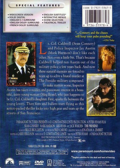 Lt. Col. Caldwell (Sean Connery) and Police Inspector Jay Austin (Mark Harmon) don't like each other. Not even a little bit. That's because Caldwell helped run Austin out of the military police a few years back.And now these natural enemies are forced to team up to solve a brutal murder at The Presidio military compound.To make matters worse Inspector Austin has taken a sudden and passionate interest in a beautiful, feisty young woman (Meg Ryan), who just happens to be Lt. Col. Caldwell's daughter.First sparls fly between young lovers. Then fists and bullets start flying as this action-packed thriller kicks into high gear and tears up the streets of San Francisco. |