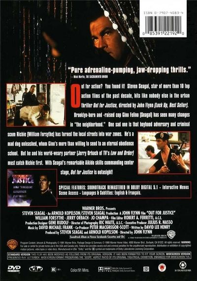 Out for action? You found it! Steven Seagal, star of more than 10 top action films of the past decade, hits like nobody else in the urban thriller Out For Justice.Brooklyn-born and raised cop Gino Felino has seen many changes in the neighborhood. One sad one is that boyhood adversary and criminal scum Richie has turned the local streets into war zones. He's a mad dog unleashed, whom Gin's more than willing to send to an eternal obedience school. But he and his world-weary partner must catch Richie first. With Seagal's remarkable Aikido skills commanding center stage, Out For Justice is outasight! |