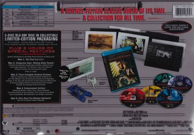Specific Introductions to All Blade Runner Versions by Ridley ScottDangerous Days: Making Blade Runner - Definitive Documentary Incorporating Outtakes, Deleted Scenes and All-New Interviews. The Ultimate Look at the Movie's Difficult Creation and Controversial Legacy.Three Complete Archival Versions: 1982 U.S. Theatrical Cut, 1982 International Theatrical Cut and 1992 Director's Cut, All Seamlessly Branched and Separately Available on one Disc with Introduction of Each Version by Ridley Scott. All Versions Digitally Restored from Original Elements for Enhanced Picture and Audio.Enhancement Archive: Audiovisual Mosaic of More Than a Dozen Segments Chronicling Aspects of the Production, Plus Focuses on Syd Mead, Jordan Cronenweth, DVD Restoration and Vintage Featurettes.Ultra-Rare Pre-Release Workprint: Plus All Our Variant Futures FeaturetteMotion Film ClipSpinner Vehicle ReplicaMiniature UnicornRare Art Folio Featuring Works by Syd Mead and Other Visionary Artists |