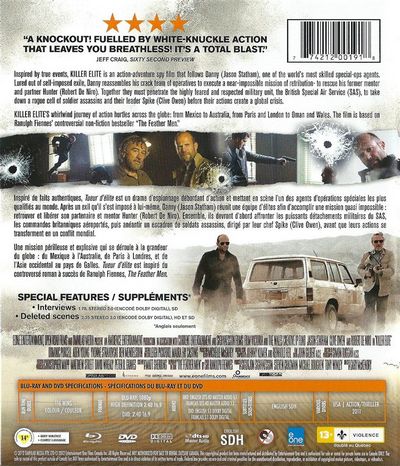 Inspired by a true events, KILLER ELITE is an action-adventure spy that follows Danny (Jason Statham), one of the world's most skilled special-ops agents. Lured out of self-imposed exile, Danny reassembles his crack team of operatives to execute a near-impossible mission of retribution- to rescue his former mentor and partner Hunter (Robert De Niro). Together they must penetrate the highly feared and respected military unit, the British Special Air Service (SAS), to take down a rogue cell of soldier assassins and their leader Spike (Clive Owen) before their actions create a global crisis.KILLER ELITE'S whirlwind journey of action hurtles across the globe: from Mexico to Australia, from Paris and London to Oman and Wales. The film is based on Ranulph Fiennes' controversial non-fiction bestseller "The Feather Men."Inspiré de faits authentiques, Tueur d'élite est un drame d'espionnage débordant d'action et mettant en scènes l'un des agents d'opérations spéciales les plus qualifiés au monde. Après un exil qu'il s'est imposé à lui-même, Danny (Jason Statham) réunit une équipe d'élites afin d'accomplir une mission quasi impossible : retrouver et libérer son partenaire et mentor Hunter (Robert De Niro). Ensemble, ils devront d'abord affronter les puissants détachements militaires du SAS, les commandos britaniques aéroportés, puis anéantir un escadron de soldats assassins, dirigé par leur chef Spike (Clive Owen), avant que leurs actions se transforment en un conflit mondial.Une mission périlleuse et explosive qui se déroule à la grandeur du globe : du Mexique à l'Australie, de Paris à Londre, et de l'Asie occidental au pays de Galles. Tueur d'élite est inspiré du controversé roman à succès de Ranulph Fiennes, The Feather Men.