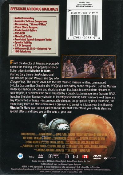 From the director of Mission: Impossible comes the thrilling, eye-popping science-fiction adventure Mission To Mars -- starring Gary Sinise (Snake Eyes) and Tim Robbins (Austion Powers: The Spy Who Shagged Me). The year is 2020, and the first manned mission to Mars, commanded by Luke Graham (Don Cheadle, Out of Sight), lands safely on the red planet. But the Martian landscape harbors a bizarre and shocking secret that leads to a mysterious disaster so catastrophic, it decimates the crew. Haunted by a cryptic last message from Graham, NASA launches the Mars Recovery Mission to investigate and bring back survivors -- if there are any. Confronted with nearly insurmountable dangers, but propelled by deep friendship, the team finally lands on Mars and makes a discovery so amazing, it takes your breath away. Mission To Mars is an action-packed rocket ride that will enthrall you with its stunning special effects and keep you on the edge of your seat. |