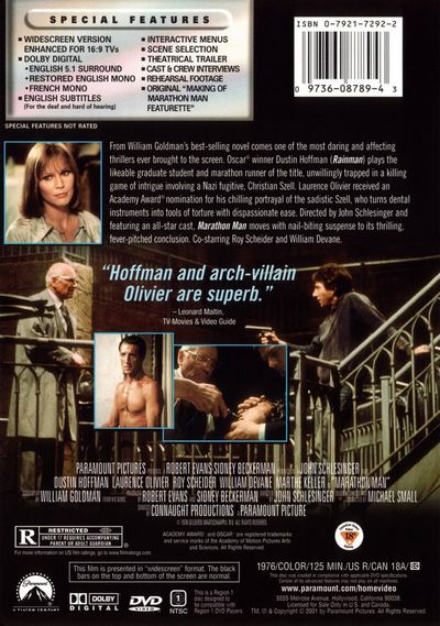 From William Goldman's best-selling novel comes one of the most daring and affecting thrillers ever brought to the screen. Oscar winner Dustin Homman (Rainman) plays the likeable graduate student and marathon runner of the title, unwillingly trapped in a killing game of intregue involving a Nazi fugitive, Christian Szell. Laurence Olivier received an Academy Award nomination for his chilling portrayal of the sadistic Szell, who turns dental instruments into tools of torture with dispassionate ease. Directed by John Schlesinger and featuring an all-star cast. Marathon Man moves with nail-biting suspense to its thrilling, fever-pitched conclusion. Co-starring Roy Scheider and William Devane. |