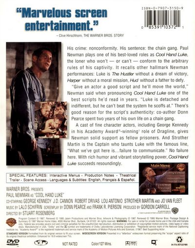 His crime: nonconformity. His sentence: the chain gang. Paul Newman plays one of his best-loved roles as Cool Hand Luke, the loner who won’t – or can’t – conform to the arbitrary performances: Luke is The Hustler without a dream of victory, Harper without a moral mission, Hud without a father to defy.“Give an actor a good script and he’ll move the world,” Newman said when pronouncing Cool Hand Luke one of the best scripts he’d read in years. "Luke is detached indifferent, but he can’t beat the system he scoffs at." There’s good reason for the script’s authenticity: co-author Donn Pearce spent two years of his own life on a chain gang.A cast of fine character actors, including George Kennedy in his Academy Award®-winning† role of Dragline, gives Newman solid support as fellow prisoners. And Strother Martin is the Captain who taunts Luke with the famous line, “What we’ve got here is...failure to communicate.” No failure here. With rich humor and vibrant storytelling power, Cool Hand Luke succeeds resoundingly. †1967: Best Supporting Actor. |