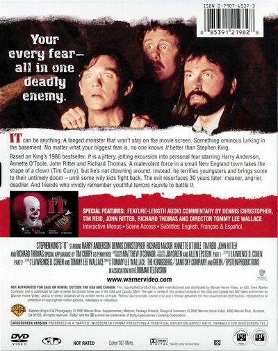 IT can be anything. A faned monster that won't stay on the movie screen. Something ominous lurking in the basement. No matter what your biggest fear is, no one knows IT better than Stephen King.Based on King's 1986 bestseller, IT is a jittery, jolting excursion into personal fear starring Harry Anderson, Annotte O-Toole, John Ritter and Richard Thomas. A malevolent force in a small New England town takes the shape of a clown (Tim Curry), but he's not clowning around. Instead, he terrifies youngsters and brings some to their untimely doom - until some wily kids fight back. The evil resurfaces 30 years later: meaner, angrier, deadlier. And friends who vividly remember youthful terrors reunite to battle IT. |
