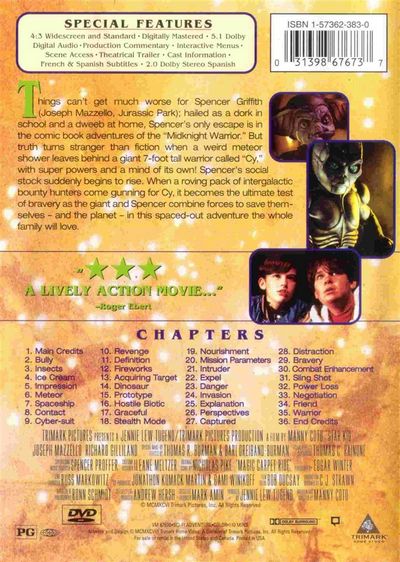 Things can't get much worse for Spencer Griffith; hailed as a dork in school and a dweeb at home, Spencer's only escape is in the comic book adventures of the "Midnight Warrior." But truth turns stranger than fiction when a weird meteor shower leaves behind a giant 7-foot tall warrior called "Cy," with super powers and a mind of its own! Spencer's social stock suddenly begins to rise. When a roving pack of intergalactic bounty hunters come gunning for Cy, it becomes the ultimate test of bravery as the giant and Spencer combine forces to save themselves - and the planet - in this spaced-out adventure the whole family will love. |