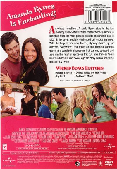 America's sweetheart Amanda Bynes stars in this fun comedy Sydney White When Tomboy Sydney(Bynes) is banished from the most popular sorority on campus, she is taken in by seven socially challenged but endearing guys. With the help of her new friends, Sydney stands up for outcasts everywhere and takes on the reigning campus queen in a popularity showdown! But can she succeed and also win the heart of gorgeous frat guy Tyler Prince? You'll love this hilarious and sweet age old story with a charming modern day twist! |