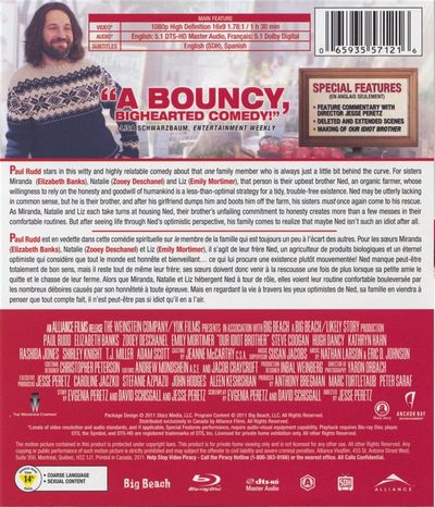 Paul Rudd stars in this witty and highly relatable comedy about that one family member who is always just a little bit behind the curve. For sisters Miranda (Elizabeth Banks), Natalie (Zooey Deschanel) and Liz (Emily Mortimer), that person is their upbeat brother Ned. an organic farmer, whose willingness to rely on the honesty and goodwill of humankind is a less-than-optimal strategy for a tidy, trouble-free existence. Ned may be utterly lacking in common sense, but he is their brother, and after his girlfriend dumps him and boots him off the farm, his sisters must once again come to his rescue. As Miranda. Natalie and Liz each take turns at housing Ned. their brother's unfailing commitment to honesty creates more than a few messes in their comfortable routines. But after seeing life through Ned's optimistic perspective, his family comes to realize that maybe Ned isn't such an idiot after all.Paul Rudd est en vedette dans cette comédie spirituelle sur to membre de la famille qui est toujours un peu a l'écart des autres. Pour les soeurs Miranda (Elizabeth Banks). Natalie (Zooey Deschanel) et Liz (Emily Mortimer), it s'agit de leur frère Ned, un agriculteur de produits biologiques et un éternel optimiste qui considère que tout le monde est honnête et bienveillant... ce qui lui procure une existence plutôt mouvementée! Ned manque peut-être totalement de bon sens, mais it reste tout de même leur frère: ses soeurs doivent donc venir a la rescousse une fois de plus lorsque sa petite amie le quitte et le chasse de leur ferme. Alors que Miranda, Natalie et Liz hébergent Ned a tour de de, elles voient leur routine confortable bouleversée par les nombreux déboires causes par son honnêteté a toute épreuve. Mais en regardant la vie a travers les yeux optimistes de Ned, sa famille en viendra a penser que tout compte fait, il n'est peut-être pas si idiot qu'il en a l'air.