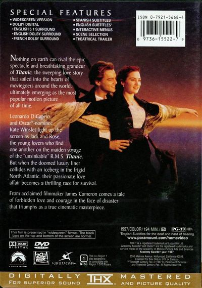 Nothing on earth can rival the epic spectacle and breathtaking grandeur of Titanic, the sweeping love story that sailed into the hearts of moviegoers around the world, ultimately emerging as the most popular motion picture of all time.Leonardo DiCaprio and Oscar nominee Kate Winslet light up the screen as Jack and Rose, the young lovers who find one another on the maiden voyage of the "unsinkable" R.M.S. Titanic. But when the doomed loxury liner collides with an iceberg in the frigid North Atlantic, their passionate love affair becomes a thrilling race for survival.From acclaimed filmmaker James Cameron comes a tale of forbidden love and courage in he face of disaster that triumphs as a true cinematic masterpiece. |