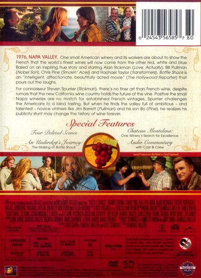 1976, Napa Valley. One small American winery and its workers are about to show the French that the world's finest wines will now come from the other red, white and blue. Based on an inspiring true story and starring Alan Rickman (Love, Actually), Bill Pullman (Nobel Son), Chris Pine (Smokin' Aces) and Rachael Taylor (Transformers), Bottle Shock is an "intelligent, affectionate, beautifully acted movie" (The Hollywood Reporter) that pours out the laughs.For connoisseur Steven Spurrier (Rickman), there's no finer art than French wine, despite rumors that the new California wine country holds the future of the vine. Positive the small Napa wineries are no match for established French vintages, Spurrier challenges the Americans to a blind tasting. But when he finds the valley full of ambitious - and talented - novice vintners like Jim Barrett (Pullman) and his son Bo (Pine), he realizes his publicity stunt may change the history of wine forever.