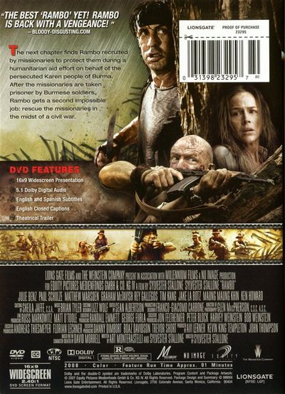 The next chapter finds Rambo recruited by missionaries to protect them during a humanitarian aid effort on behalf of the persecuted Karen people of Burma. After the missionaries are taken prisoner by Burmese soldiers, Rambo gets a second impossible job: rescue the missionaries in the midst of a civil war. |