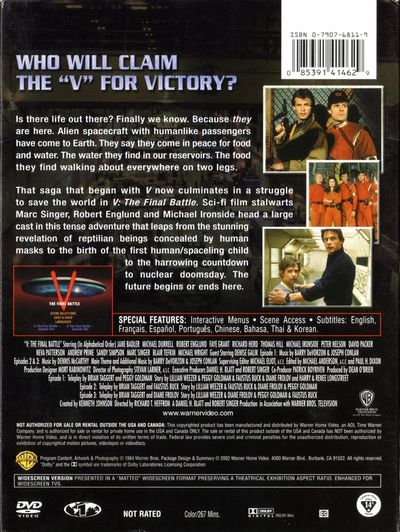 Who will claim the "V" for victory?Is there life out there? Finally we know. Because they are here. Alien spacecraft with humanlike passengers have come to Earth. They say they come in peace for food and water. The water they find in our reservoirs. The food they find walking about everywhere on two legs.That saga that began with V now culminates in a struggle to save the world in V: The Final Battle. Sci-fi film stalwarts Marc Singer, Robert Englund and Michael Ironside head a large cast in this tense adventure that leaps from the stunning revelation of reptilian beings concealed by human masks to the birth of the first human/spaceling child to the harrowing countdown to nuclear doomsday. The future begins or ends here. |