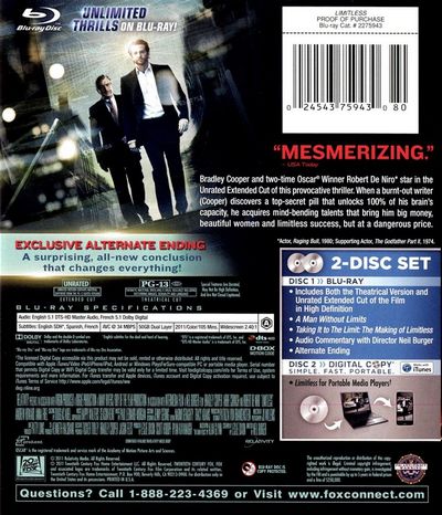 Bradley Cooper and two-time Oscar® Winner Robert De Niro* star in the Unrated Extended Cut of this provocative thriller. When a burnt-out writer (Cooper) discovers a top-secret pill that unlocks 100% of his brain's capacity, he acquires mind-bending talents that bring him big money, beautiful women and limitless success, but at a dangerous price. |